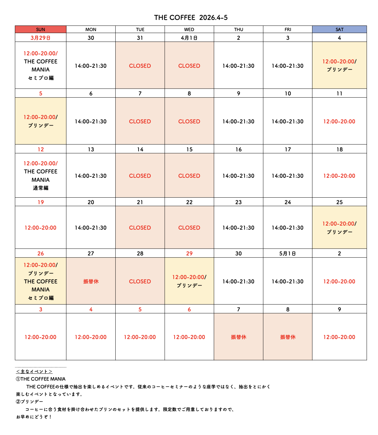 | 木・金曜 | 14:00-21:30(LO21:00) コーヒー×◯◯ POP UP TIME 通常メニュー 詳細 |